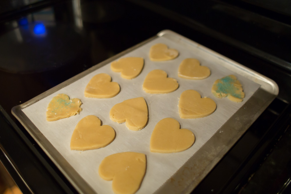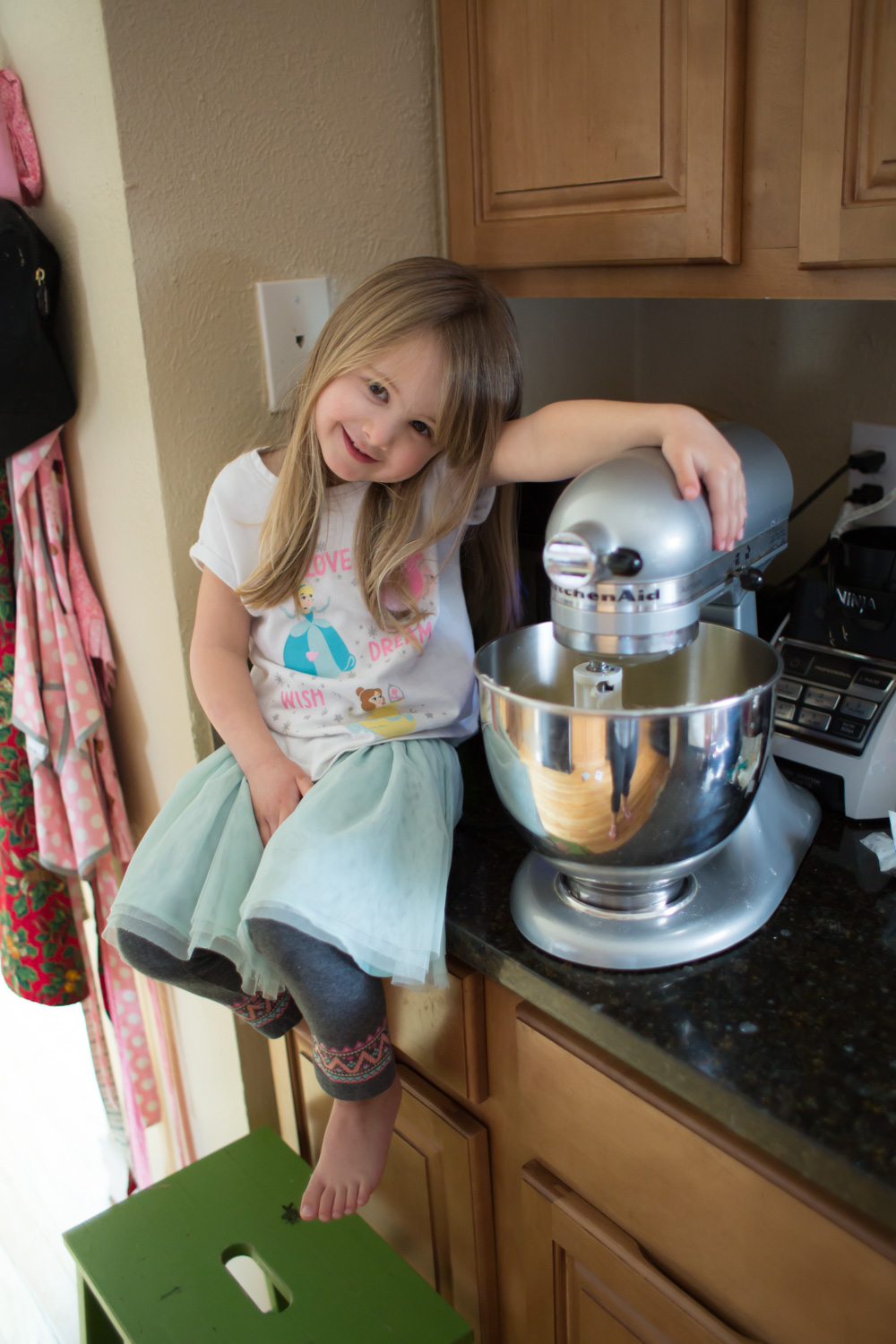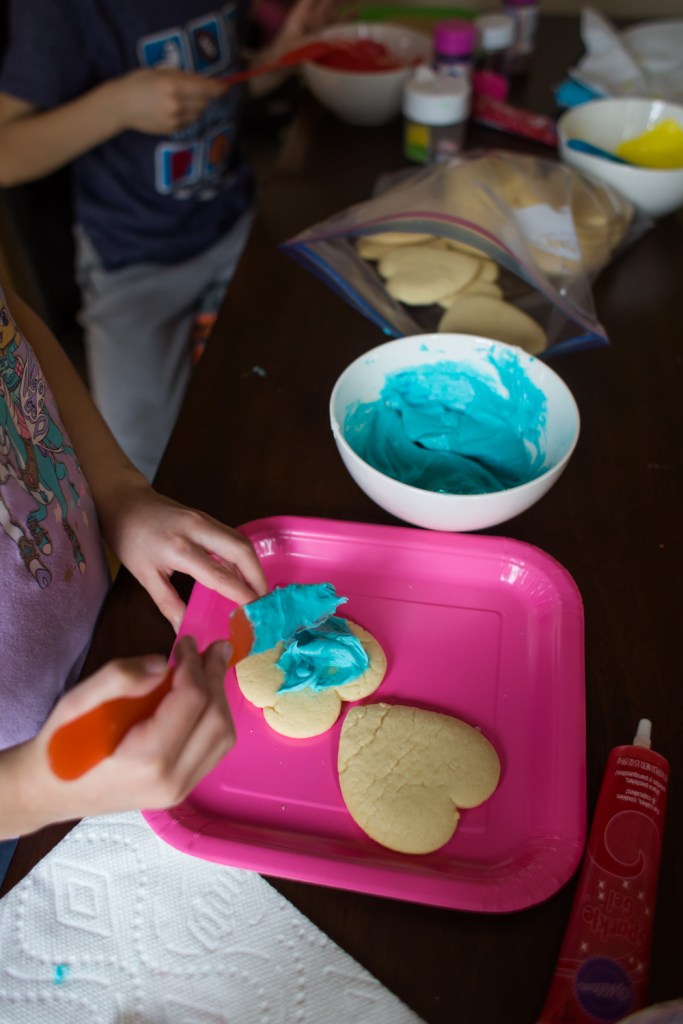 The next day my oldest was sick so we had to postpone our decorating. Since I had the dough ready to go Camryn and I rolled it, cut out the hearts and baked the cookies. They weren’t perfect, but they sure tasted good. The hint of sea salt make a huge difference. Camryn couldn’t wait to decorate them so I allowed her to decorate a few of the ones she rolled out—blue sprinkles for the win! We froze the soft cookies. I made sure they were slightly under-baked so they would freeze well.