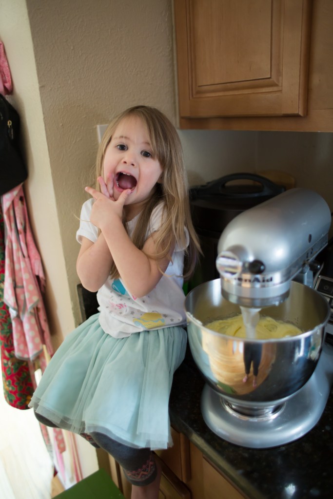 My little one enjoys helping me in the kitchen. When she hears any dish come out of its cupboard she instantly appears, pushing a chair or her stool to the counter in order to help. Her two little hands washed and nothing in her mouth means she can help mommy.